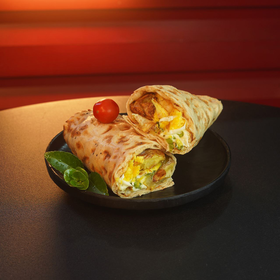 ساندویچ سیب زمینی تنوری طعم دار شده با کره و ادویه مخصوص به همراه تخم مرغ به همراه سالاد