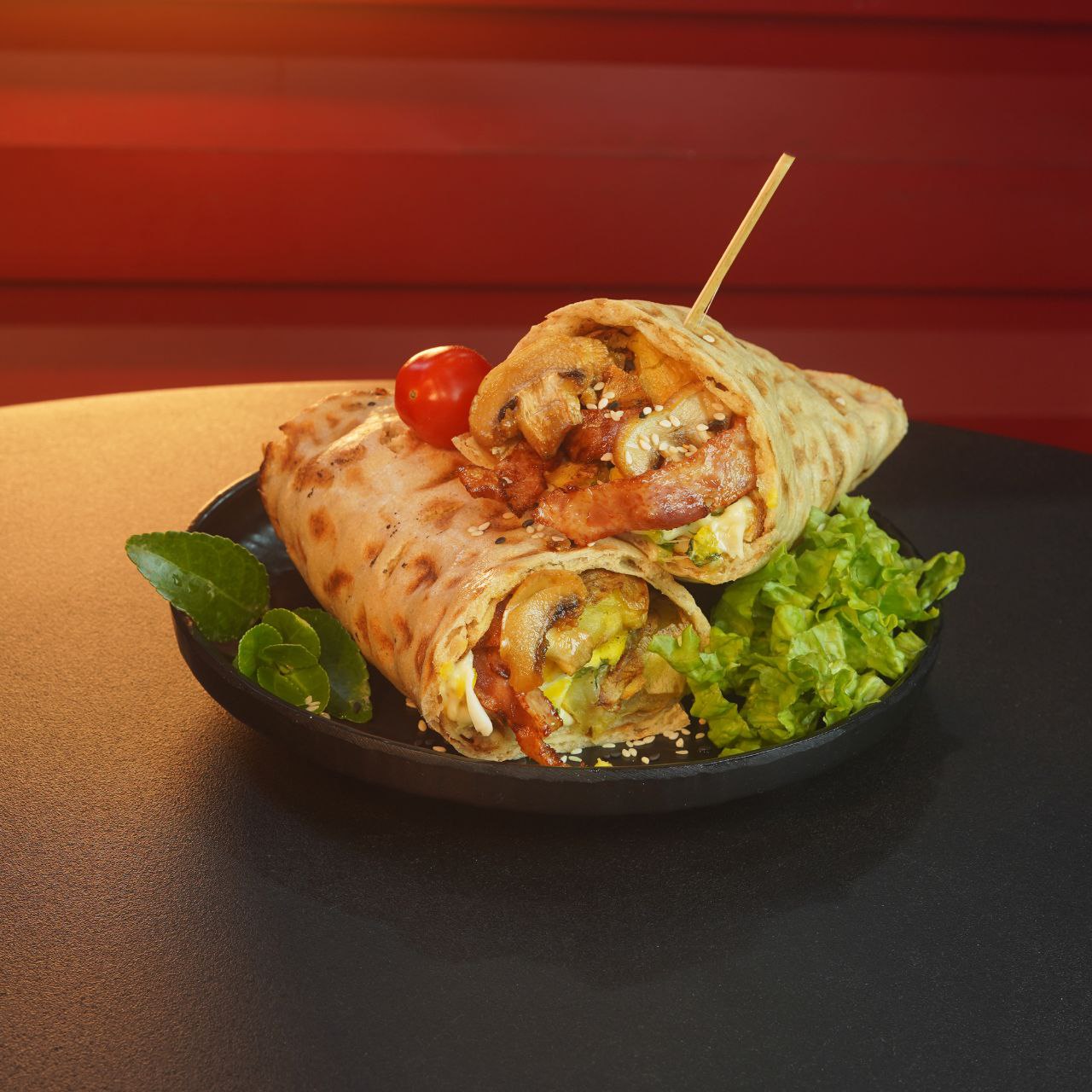 ساندویچ سیب زمینی تنوری طعم دار شده با کره و ادویه مخصوص با ۱۰۰ گرم رست بیف با سس مخصوص به همراه سالاد
