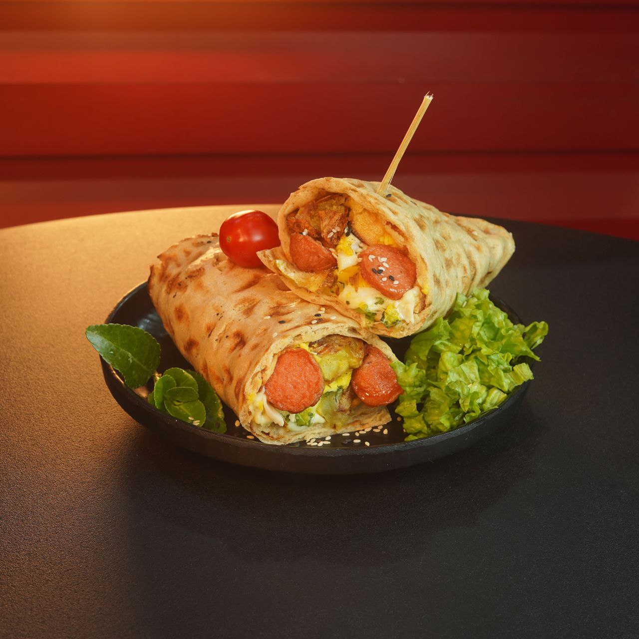 ساندویچ سیب زمینی تنوری طعم دار شده با کره و ادویه مخصوص با پنیر موزارلا و هات داگ به همراه سالاد
