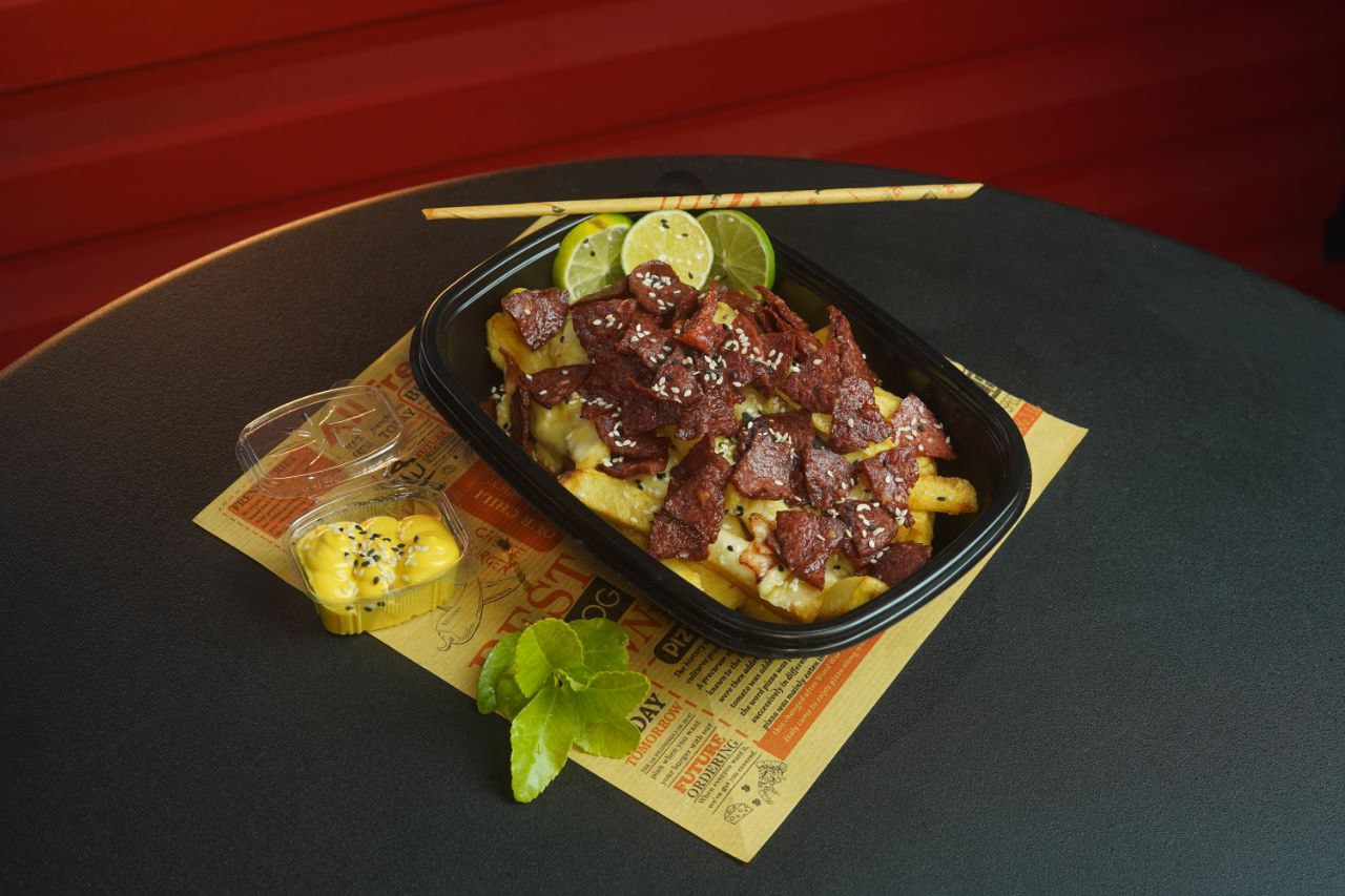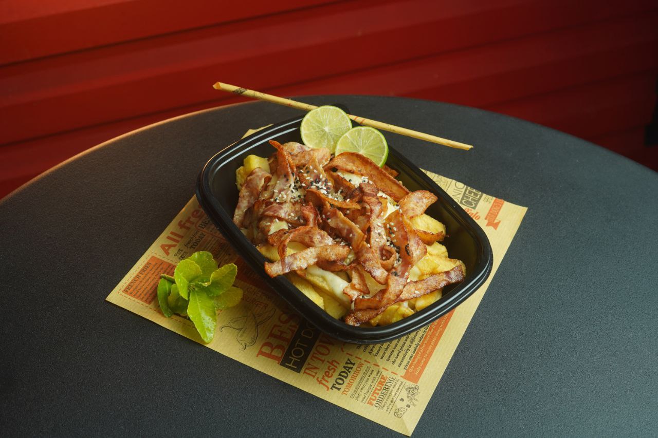 ۳۰۰ گرم سیب زمینی سرخ کرده به روش بلژیکی به همراه پنیر موزارلا و ژامبون ۸۰ درصد
