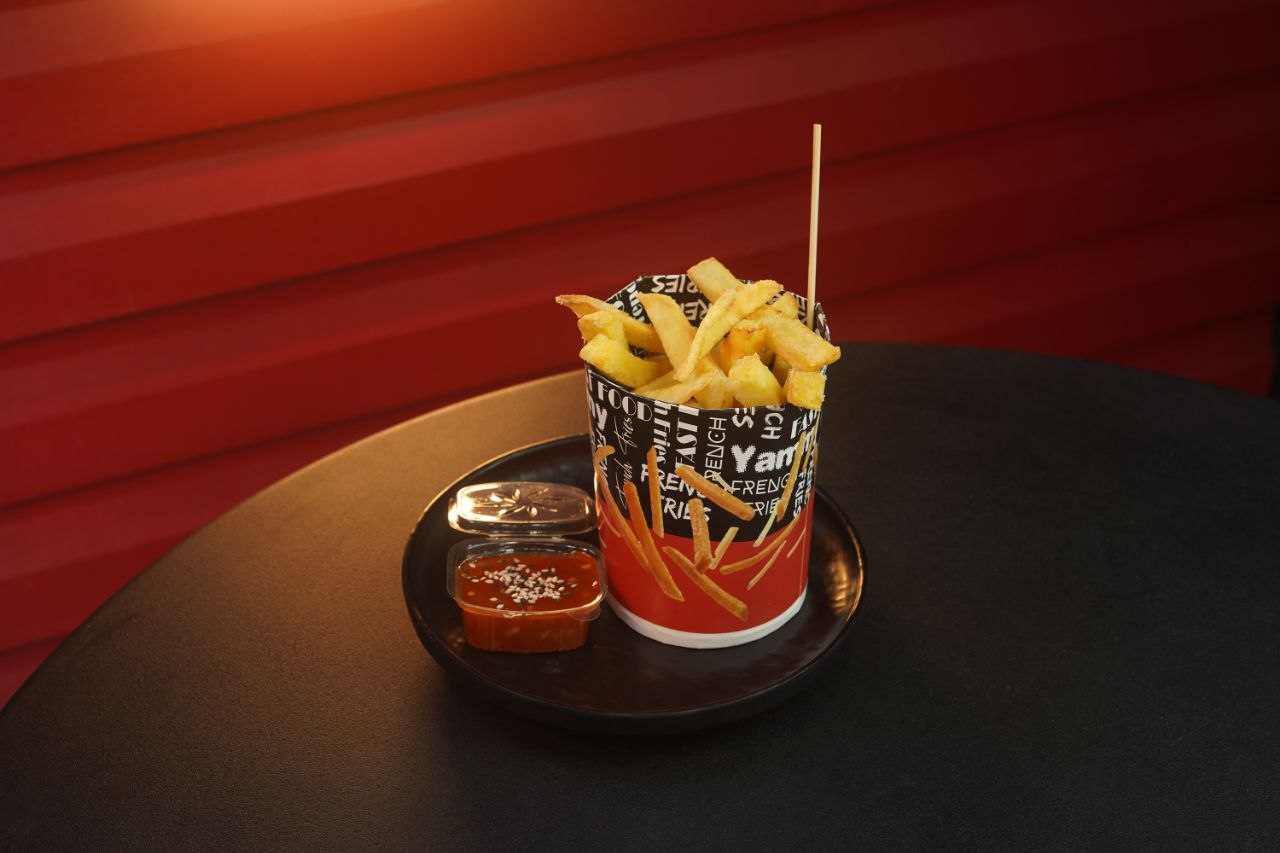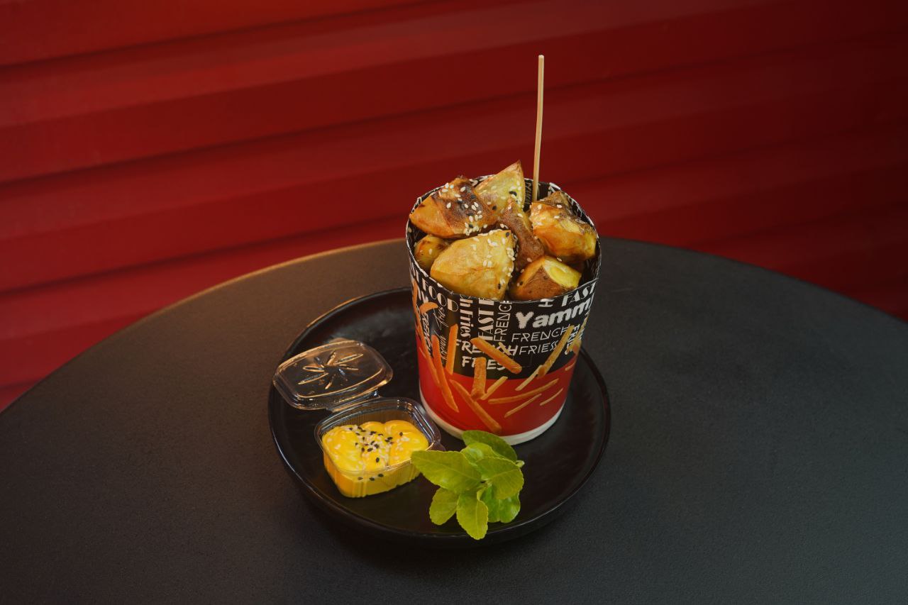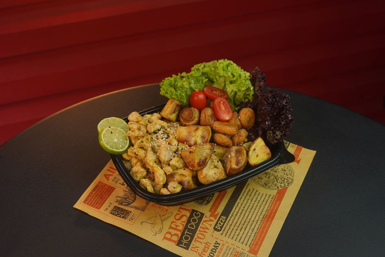 ۳۰۰ گرم سیب زمینی سرخ کرده به روش بلژیکی با ۱۵۰ گرم سینه مرغ گریل با سس مخصوص